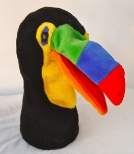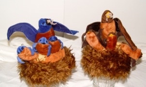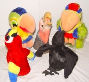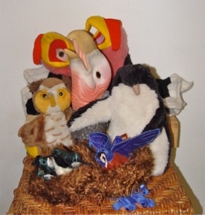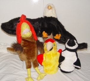 Back from left: turkey vulture, puffin, bald eagle. Middle from left: hedgehog, owl. Front from left: duck, crow
