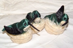 Back from left: turkey, pink bird, turkey. Middle from left: owl, penguin. Front from left: nest of hummingbirds, nest of bluebirds.